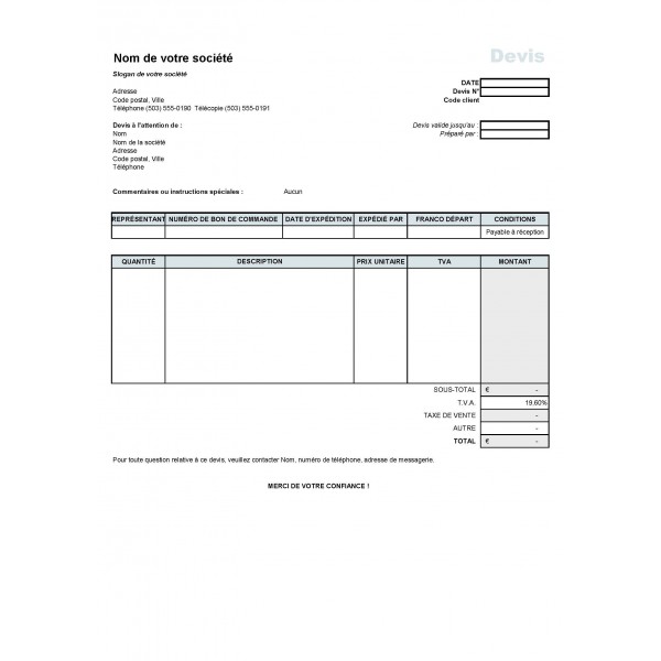 Modèle de devis standard. Vous pouvez télécharger, modifier ce fichier avec vos données personnelles et votre logo. Votre identité visuelle prend ainsi tout son sens.